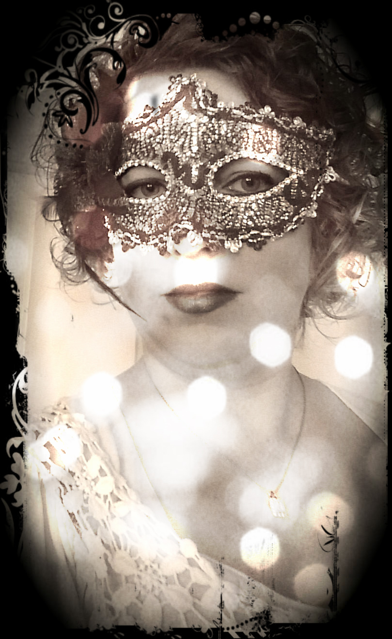 Full lips bowed below the mask, and her mass of dark hair was wound into an